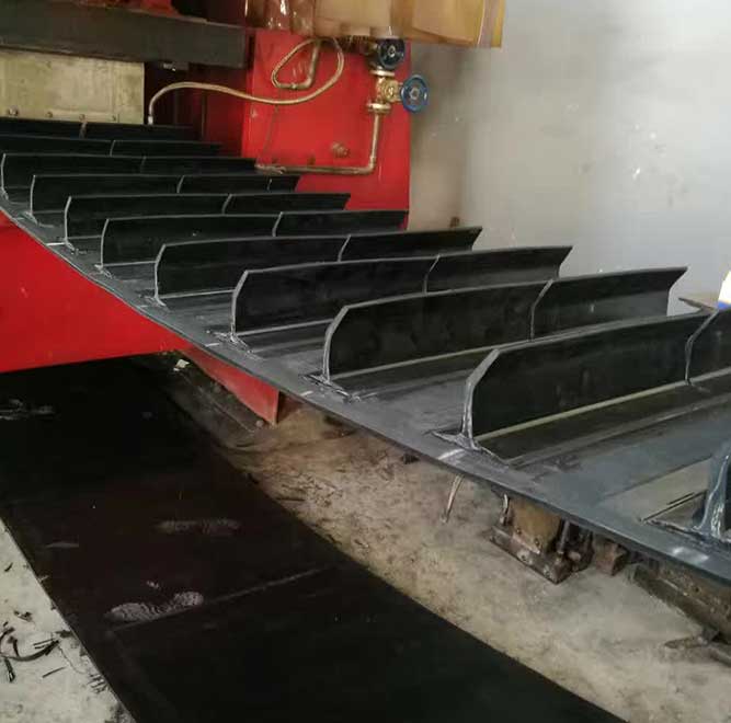 更換輸送帶,可將新帶與舊帶連在一起,卸帶與安裝新輸送帶同時進行對于水平運轉的輸送機,可在任何一點切斷舊輸送機,傾斜方向運轉的輸送機,則需選好切斷點,防止因自重引起下滑失控。在輸送機上將新帶的位置放正后,用夾具將膠帶的一端固定好,然后與繞過輥與帶輪的繩索相連,通過牽引裝置將輸送帶平衡的架到輸送機上,牽引時,要防止輸送帶與機架相互擠壓。